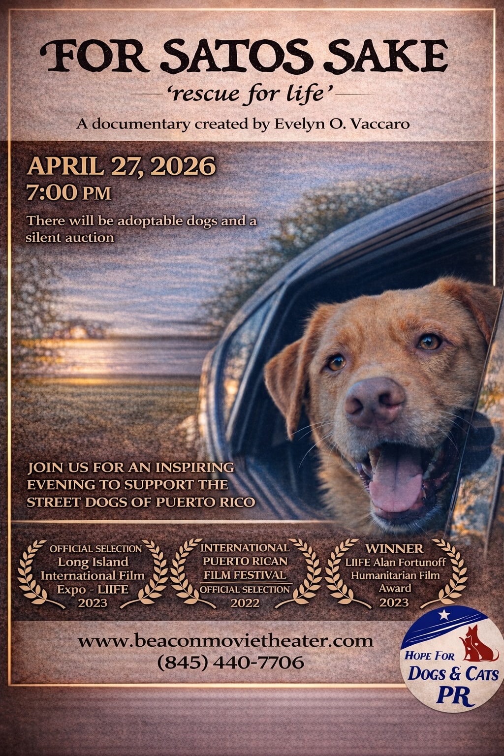 Join us for the screening of "For Satos Sake" Documentary - a story about the plight of the homeless animals of Puerto Rico and everyday people turned rescuers who are helping to rewrite their story. Followed by a fundraising adoption event by local rescue organizations, Hope for Dogs and Cats of PR & Miracles for Satos.